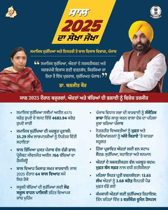 चंडीगढ़, 22 दिसंबर | मुख्यमंत्री स भगवंत सिंह मान के नेतृत्व में पंजाब सरकार द्वारा समाज के हर वर्ग के कल्याण के लिए निरंतर जन-हितैषी नीतियां लागू की जा रही हैं। बुज़ुर्गों, महिलाओं, बच्चों और दिव्यांगजनों की सामाजिक एवं आर्थिक सुरक्षा सुनिश्चित करने के लिए वर्ष 2025 (वित्तीय वर्ष 2025-26) के दौरान कई ऐतिहासिक पहलें की गई हैं। यह जानकारी सामाजिक सुरक्षा, महिला एवं बाल विकास मंत्री डॉ. बलजीत कौर ने दी।